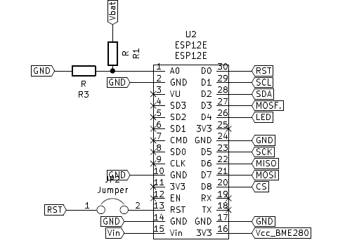 La lectura de la tensión de batería se hace a través de un divisor resistivo, ya que la entrada analógica solo admite tensiones de entrada de hasta 1V (aunque la propia placa ESP12E ya incluye un divisor resistivo, y podríamos subir hasta 3.3V de entrada).