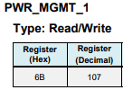 Si acudimos al datasheet del MPU6050 vemos como estos números que utilizamos en la configuración tienen perfecto sentido. En primer lugar utilizamos el registro 6B para activar el modo configuración del sensor y poder modificar los parámetros internos: