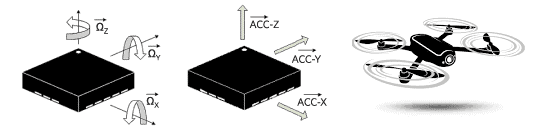 IMU o Inertial Mesurment Module es el sensor más importante del drone y sin el cual es imposible mantener el drone en el aire de forma autónoma. Este pequeño sensor proporciona lecturas de velocidad de rotación (giroscopio) y aceleración en los tres ejes de movimiento (acelerómetro). Procesando adecuadamente estas señales podremos obtener las dos variables imprescindibles para volar el drone: la velocidad de rotación de los tres ejes en grados por segundo (º/s) y la inclinación del drone (º). El sensor que yo utilizo es el MPU6050.
