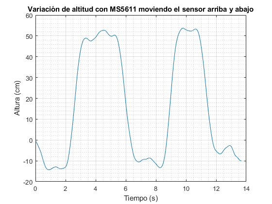 Aquí os dejo una imagen de la estimación de la altitud. Simplemente he cogido el sensor y lo he elevado y bajado dos veces a una altura aproximada de medio metro, los resultados como veis son bastante precisos.