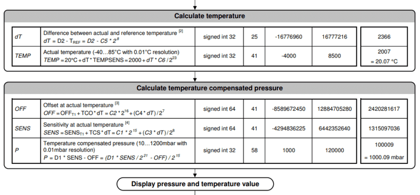 Una vez obtenidas las variables D1 y D2 es necesario procesar adecuadamente estos datos para obtener valores de presión y temperatura compensados. Si os fijáis en el código que he utilizado para ello, lo único que se hace es copiar las ecuaciones de la imagen inferior e ir siguiendo las pautas que se indican. Las constantes C1, C2… C6 se utilizan en este punto para calcular los diferentes parámetros: